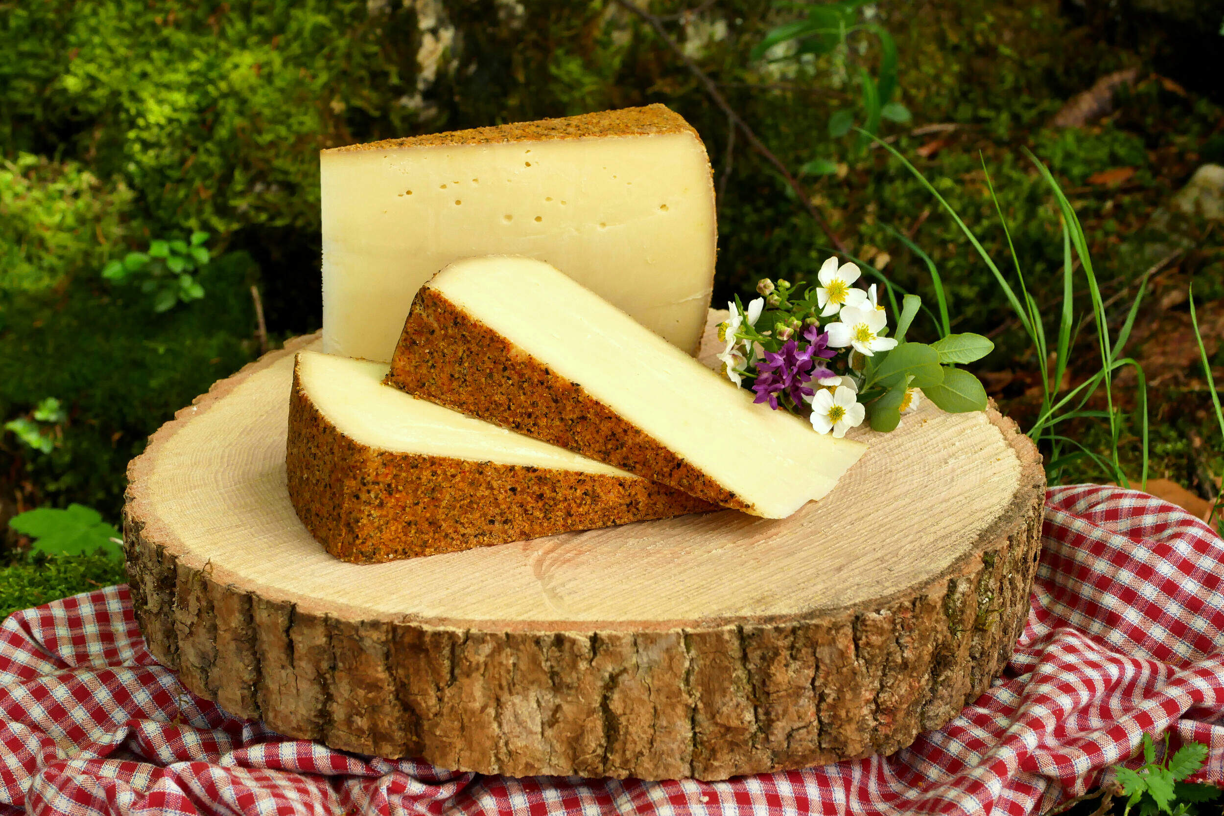 Der Orange-Pfeffer ist ein fein würziger Schnittkäse aus pasteurisierter Milch mit einer essbaren Rinde mit Orangengranulat und Pfeffer.